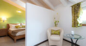 Alloggiare in questo sottotetto non vuol dire soltanto rilassarsi nella propria camera, ma significa rimanere rapiti e affascinati da quello che in passato era un vecchio fienile centenario, oggi completamente ristrutturato.Significa percepire ancora la fatica di chi vi lavorava, sentire ancora il profumo del fieno in ogni anfratto, quasi a rivivere quei momenti di vita dura ma sereni di tanti anni fa. A proteggervi sopra le vostre teste il tetto…. in legno di abete lamellare, di un bianco candido quasi a voler donare serenità a chi vi soggiorna.